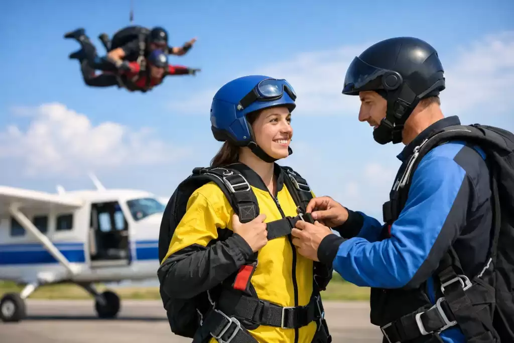 Then comes harness fitting. Your tandem harness needs to sit correctly and feel snug. It should not be painfully tight, but it should feel secure. Your instructor or ground crew will adjust it and inspect it carefully. If something feels off, say so. Beginners sometimes stay quiet because they assume discomfort is normal. Speak up. Safety works best when communication goes both ways.